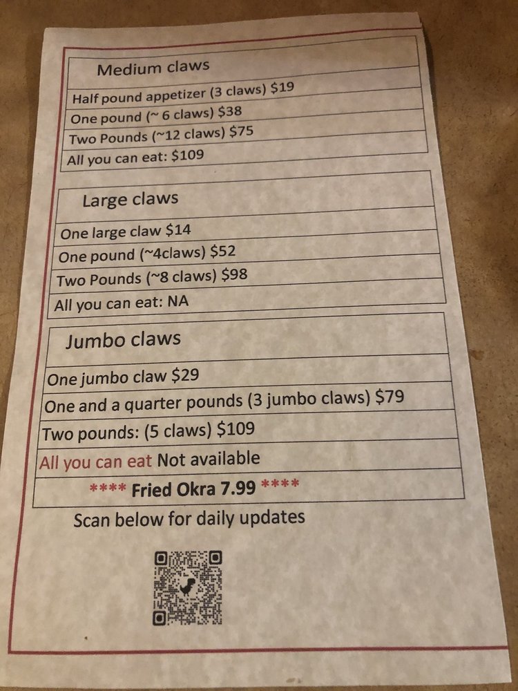 Four clusters, each cluster a half pound served hot with drawn butter Served with choice of side plus hush-puppies and coleslaw