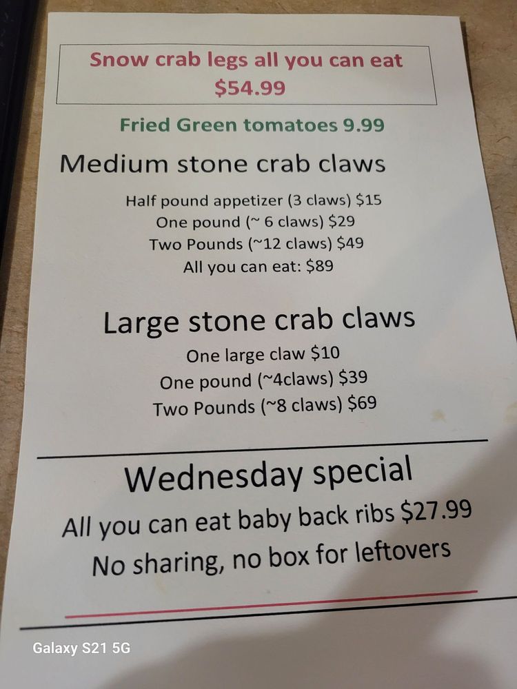Florida stone crabs are in season until May 15th. Click https://www.catfishdeweys.com/stone-crab-status for prices and availability. That page is updated daily