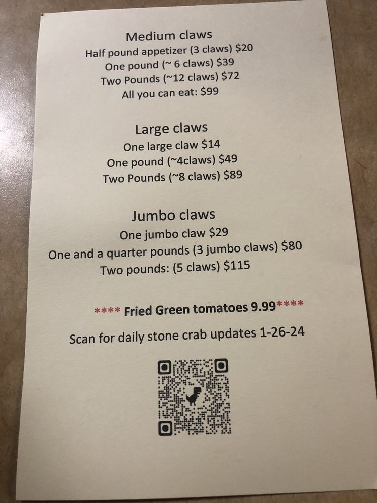From this website's main menu, go to "Stone crabs and general news" to find daily updates about fresh Florida stone crabs in stock and current prices